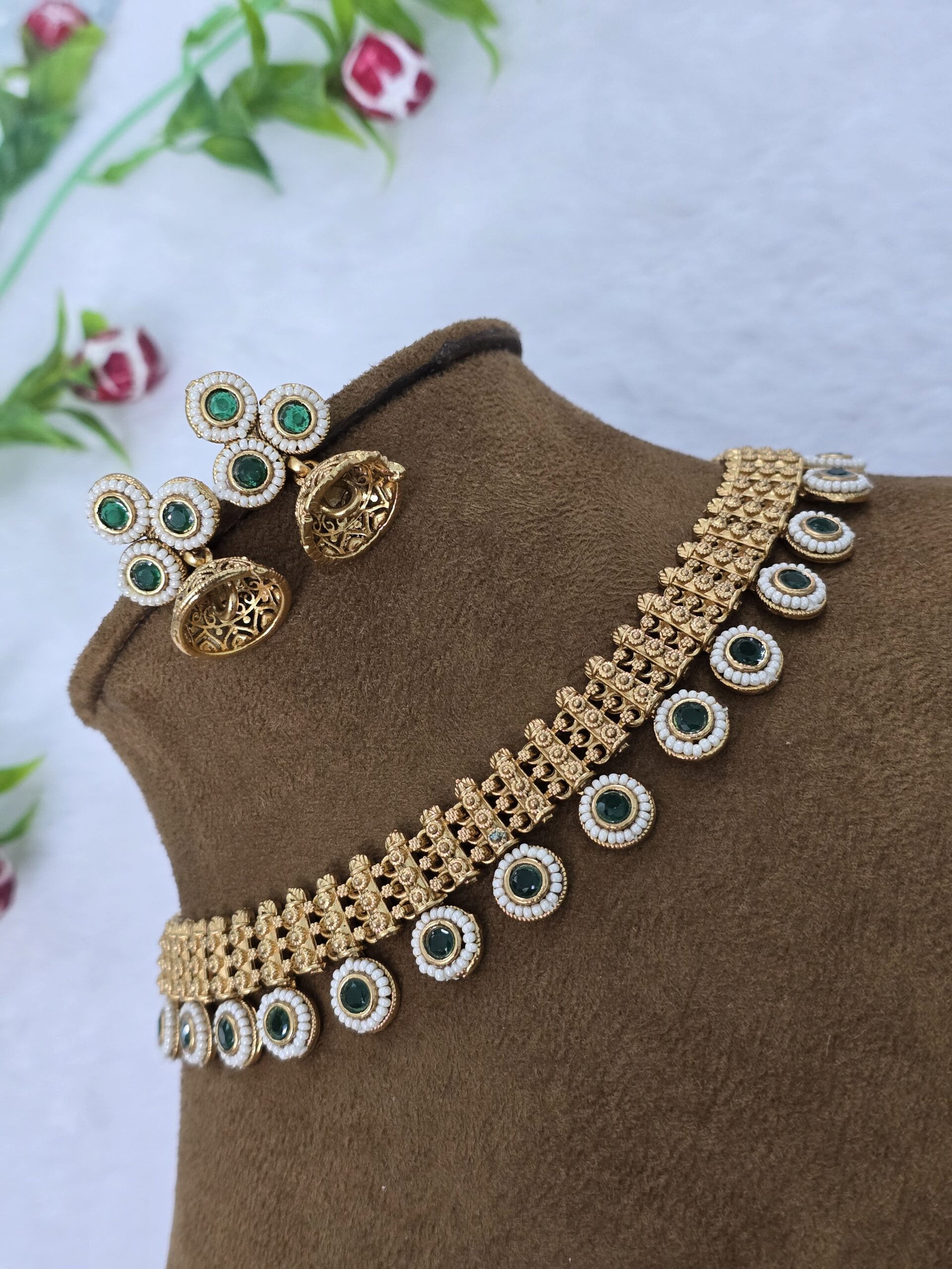 Our Indian necklace set for women includes a necklace and jhumka earrings. The necklace adorns the traditional gold work and intricate designs. The emerald stones at the end of the necklace accentuate the neck.
